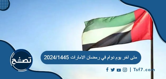 إنّ آخر يوم دوام في الإمارات العربية المتحدة في رمضان هو يوم الجمعة الموافق ليوم السادس والعشرين من شهر رمضان لعام 1445 هجرية والموافق ليوم الخامس من شهر أبريل نيسان من عام 2024م، حيث ينص قانون الإجازات في الإمارات العربية المتحدة أن عطلة عيد الفطر تبدأ من يوم التاسع والعشرين من شهر رمضان وتنتهي في يوم الثالث من شهر شوال من كل عام، ولكن يوم التاسع والعشرين من رمضان لهذا العام سوف يوافق يوم الأحد، ومن المعروف أنّ يوم السبت ويوم الأحد هما يوما إجازة نهاية الأسبوع في الإمارات العربية المتحدة، وعليه فإنّ آخر يوم دوام سوف يكون يوم الجمعة الذي يداوم فيه الإماراتيون نصف اليوم فقط، وهذا يعني أنَّ الإجازة سوف تكون في الأيام الآتية: [1]